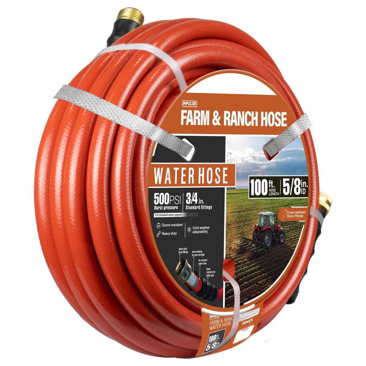 The Impulse Farm & Ranch Hose is a durable, flexible, and kink-resistant PVC water hose ideal for heavy-use applications in farming, gardening, landscaping, and construction. Available in 5/8 inch diameter with 100 ft length options, it is reinforced with high-strength polyester braid, built with lead-free crush-proof brass couplings, and designed to withstand a burst pressure of 400+ PSI. This hose fits all standard garden faucets and water accessories, making it a versatile solution for watering livestock, irrigating crops, washing machinery, or handling outdoor residential and commercial water supply needs.